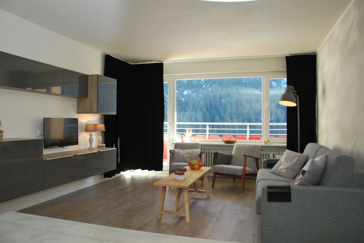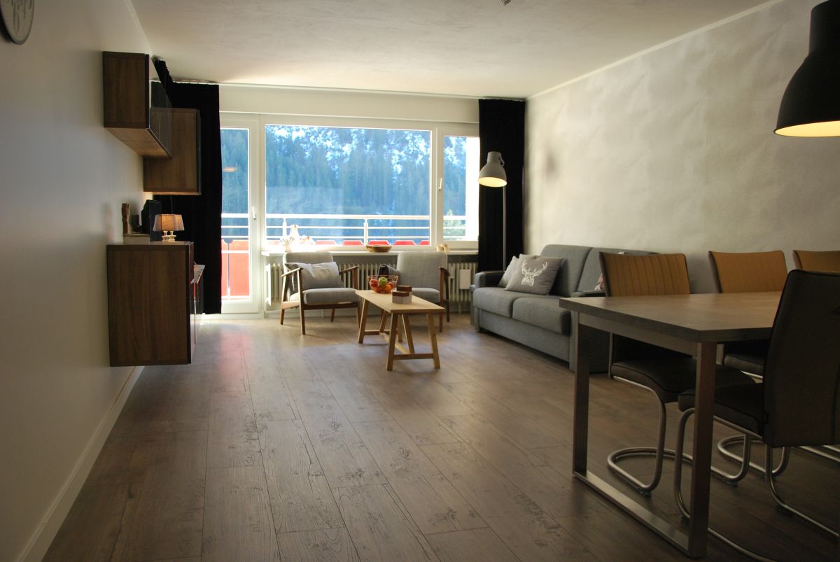 Unsere komplett renovierte Wohnung bietet Platz für 4 Personen (eventuell ein 5. Kind) und befindet sich auf der 5. Etage des Aparthotels (Aufzüge anwesend). Die Wohnung hat einen Balkon auf der Südseite, wo Sie die Sonne genießen mit einem fantastischen Blick auf der Zwölferkopf und der Widderstein (2536 m). Unsere Wohnung hat eine Fläche von 55 m².